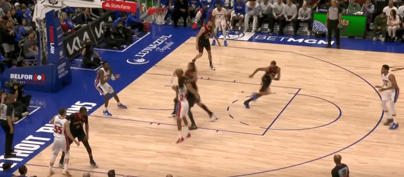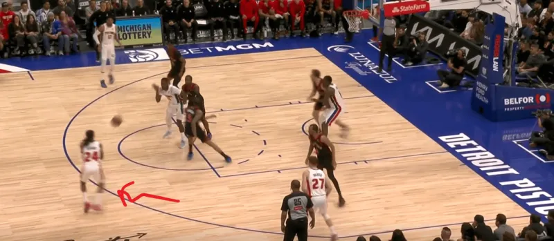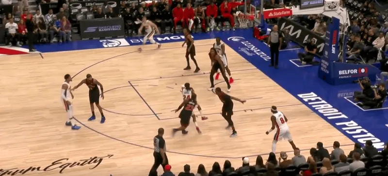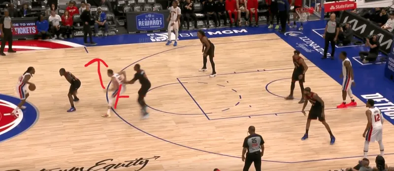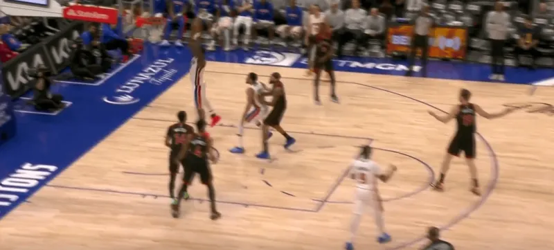 詹金斯和杜伦的掩护后后者快速顺下,珀尔特尔和沃尔特延误詹金斯,这时底线的奥萨向外撤出,slot区的哈里斯同时切入禁区帮助詹金斯和杜伦获得了连线机会,巴恩斯和英格拉姆都在无球端受到干扰,詹金斯得以抓住机会吊给篮下的杜伦:
